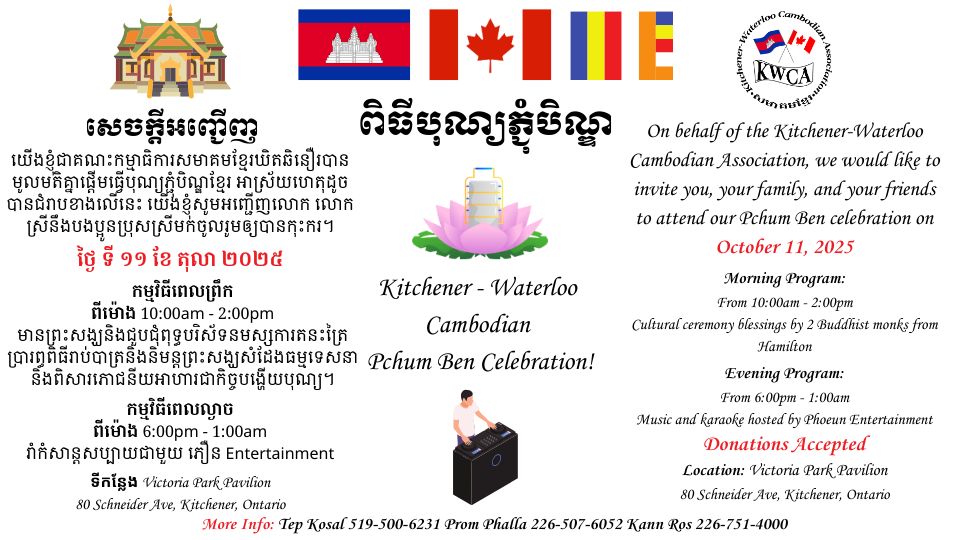 The Kitchener & Waterloo Cambodian Association (KWCA) is a non-profit organization dedicated to promoting and preserving Khmer (Cambodian) culture, supporting interaction and understanding among those who bear interest in Cambodia and her culture and people, and enhancing the economic, cultural, and social quality of life of Cambodians and Cambodian/Canadian regardless of political affiliation, race, sex, or religion. KWCA’s activities include small business development, education, training, and multi-community collaboration for social and economic programs. Based in Kitchener, the KWCA serves Cambodians and Cambodian Canadians throughout Ontario Vision Statement.